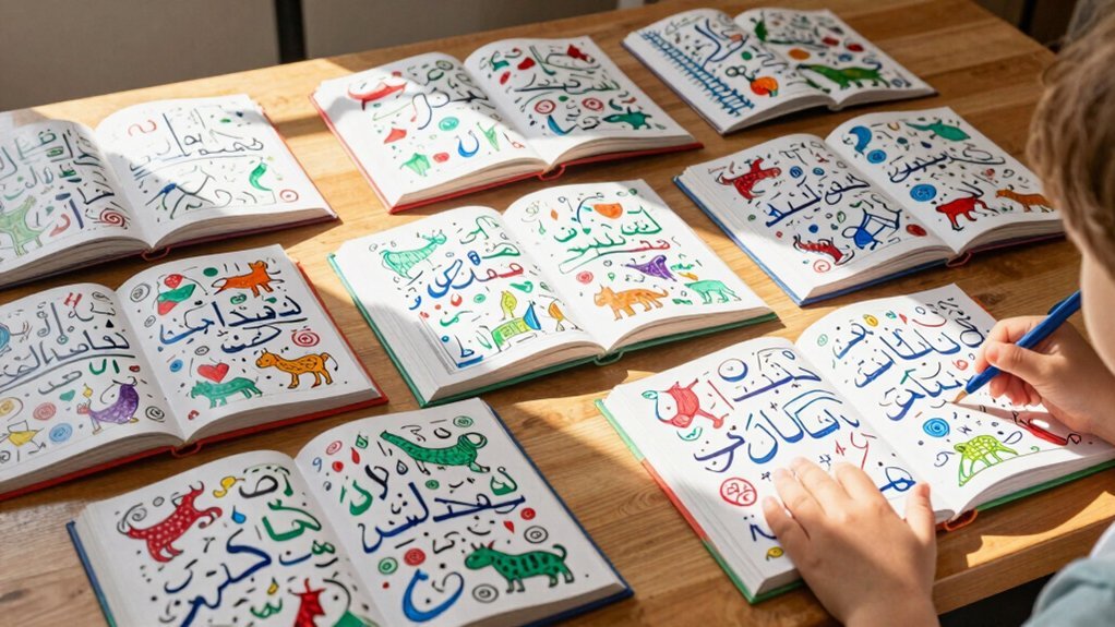Bold, high‑contrast lettering makes the letters instantly recognizable, but the learning experience hinges on how deeply the book explains each character’s sound, shape, and usage. You should look for clear phonetic guides that pair each letter with familiar words and simple pronunciation tips, so kids can hear the difference between similar sounds. Detailed visual breakdowns—showing the isolated form, initial, medial, and final variations—help them see how the script flows. Rich contextual examples, like short sentences or rhyming verses, illustrate real‑world usage and reinforce memory. Interactive activities such as tracing, matching games, or pronunciation quizzes keep engagement high. Finally, guarantee the explanations are age‑appropriate, avoiding jargon while still providing enough depth to build a solid foundation for future reading.